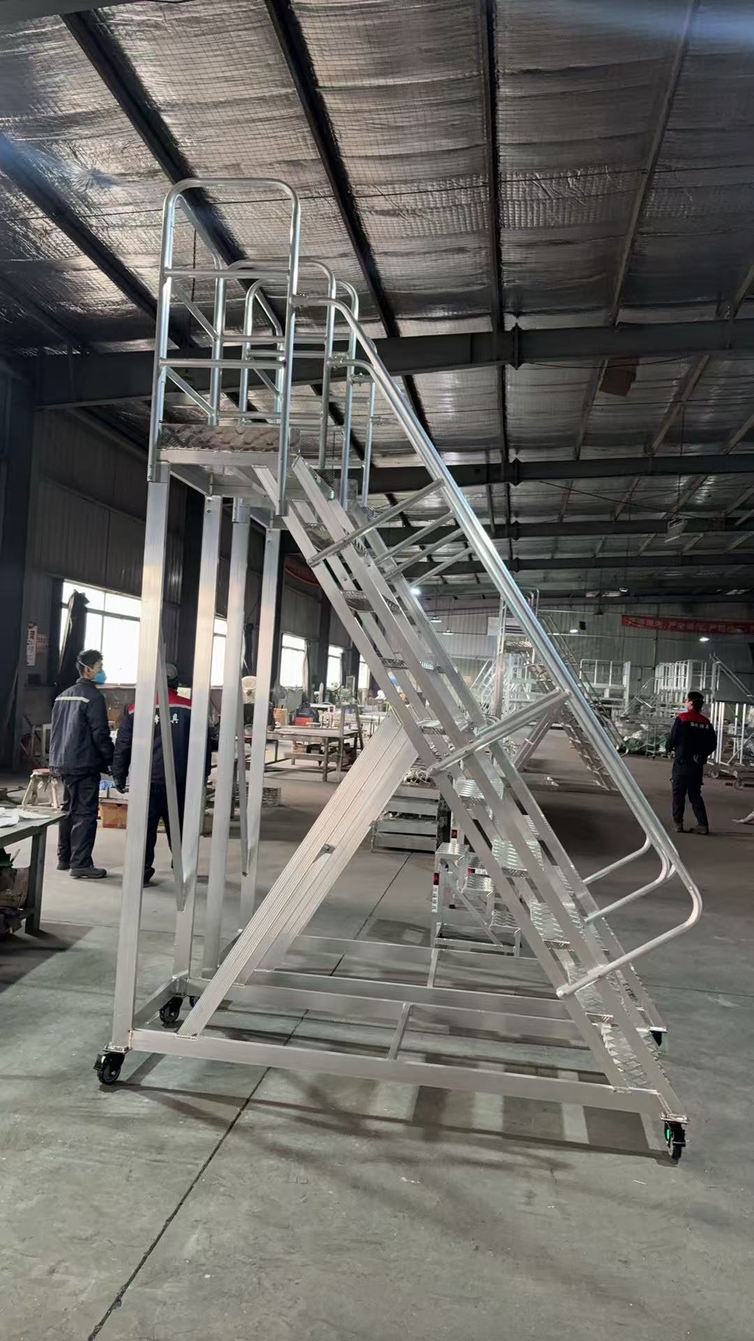 客户原有的移动式脚手架构思存在两大痛点:一是传统钢铁制登高车自重较大,容易对厂房的环氧地坪造成压痕与刮擦;二是标准尺寸的登高车无法在遍布实验台与设备的狭窄通道中灵活移动,且缺乏针对精密仪器车间防静电、防撞击的特殊考量。经过现场勘测与技术沟通,客户决定摒弃标准品,定制2台铝合金移动登高车。